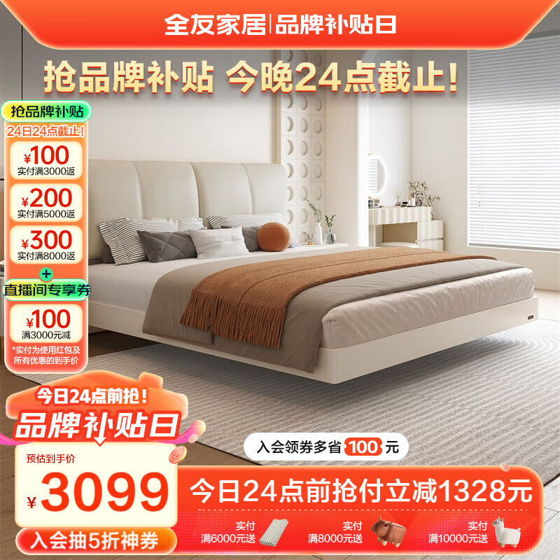 全友家居 现代简约大象耳朵皮艺软包床1.8米主卧室双人悬浮大床129303价格:4427.14元!