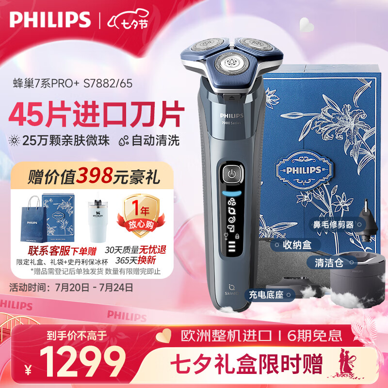 飞利浦(PHILIPS)电动剃须刀蜂巢7系Pro+ SkinIQ高端系列刮胡刀 【整机荷兰进口】七夕情人节礼物送男友老公S7882价格:1359.00元!