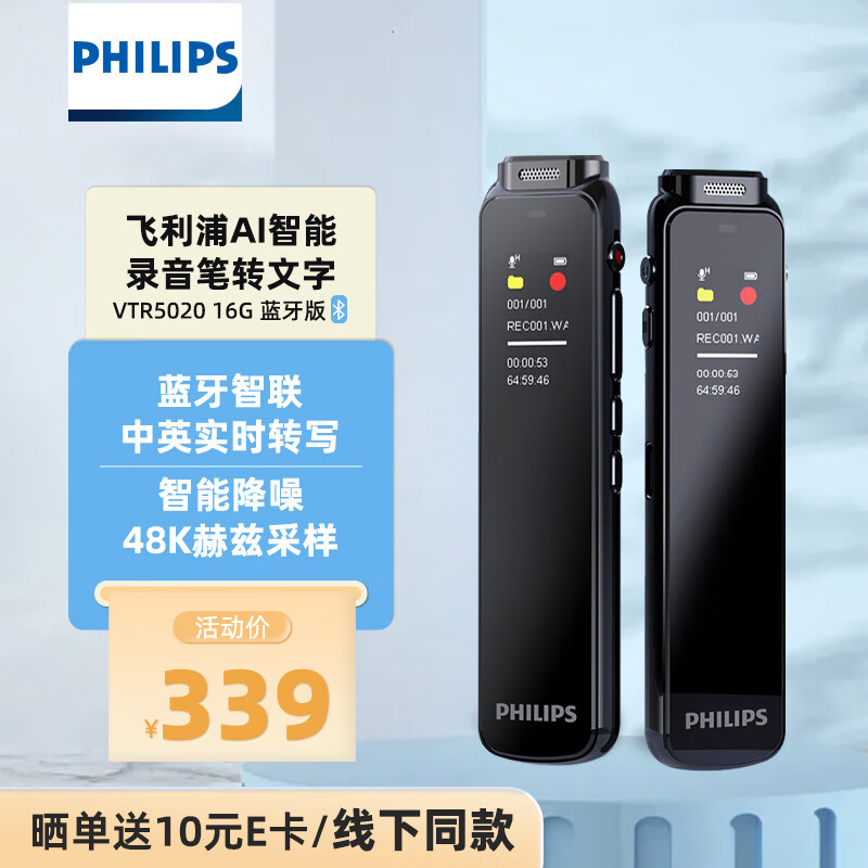飞利浦(PHILIPS)智能录音笔VTR5020 语音转文字专业录音设备 取证专用随身携带商务会议学习记录神器16G 蓝牙版价格:359.00元!