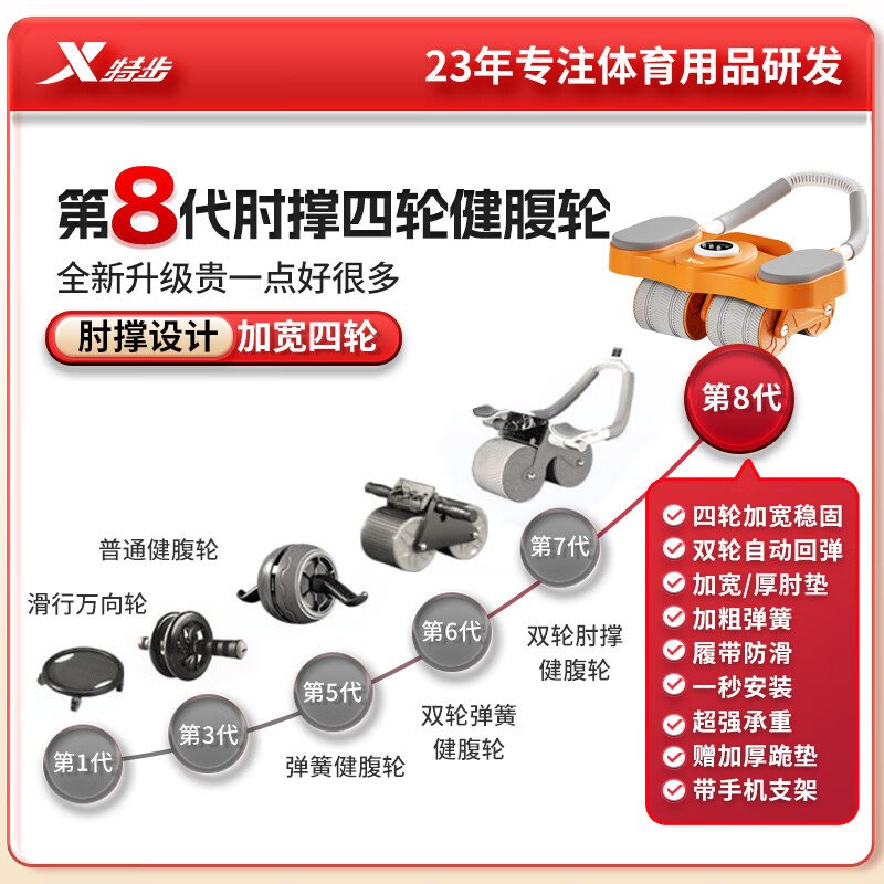 特步(XTEP)四轮健腹轮自动回弹肘撑腹肌卷腹家用健身器材运动平板支撑男女价格:59.00元!