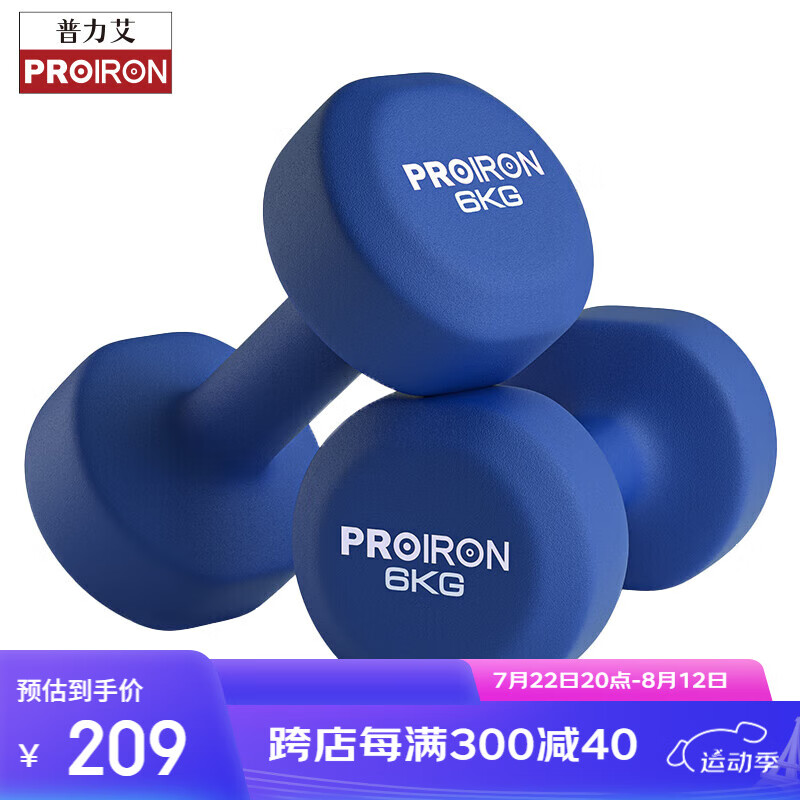 PROIRON普力艾 哑铃 男女士家用浸塑纯铁环保套装亚铃 深蓝色 6kg*2价格:199.00元!