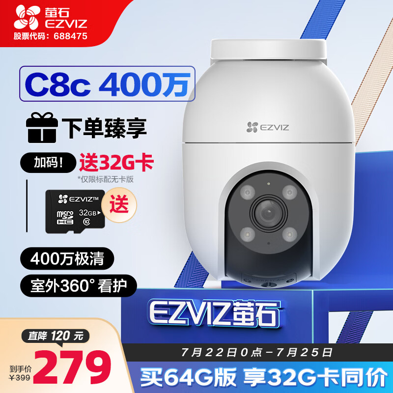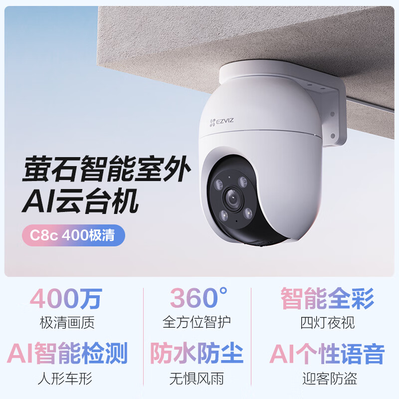 萤石 C8C 400万摄像头 无线WiFi 室外双云台360° 防水防尘监控 手机远程 人形检测 全彩夜视价格:279.00元!