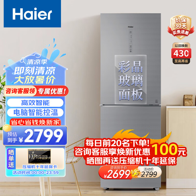 海尔(Haier)冰箱双开门272升 双循环变频 风冷无霜 一体式显示屏 彩晶玻璃面板 线下同款冰箱 BCD-272WDCI价格:2967.00元!