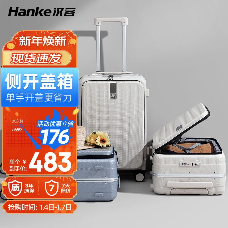 汉客行李箱男拉杆箱女旅行箱69升大容量24英寸象牙白镇店前侧开盖铝框价格:659.00元!