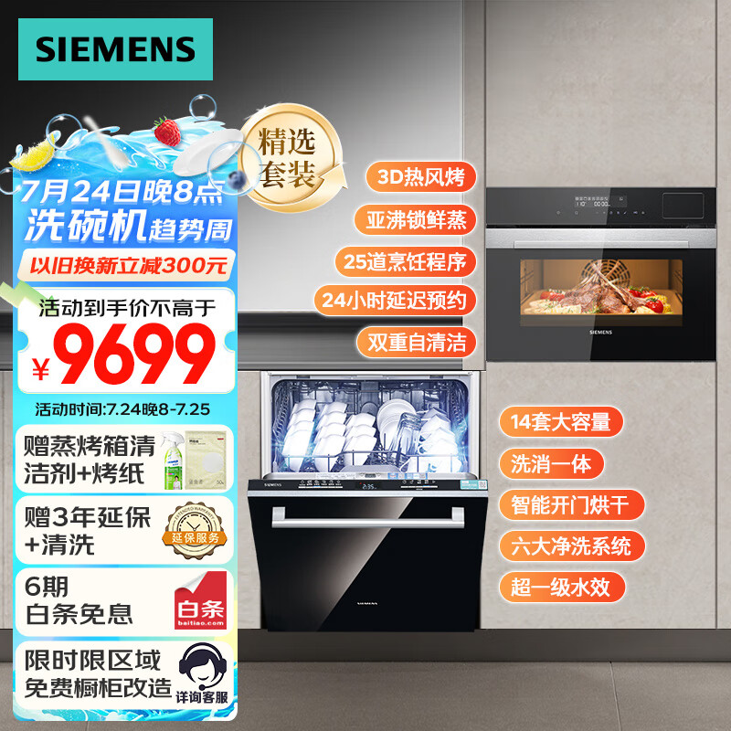 西门子(SIEMENS)全自动家用嵌入式洗碗机636pro 蒸烤一体机套装 14套大容量 CS389ABS0W+SJ63EX00KC(含黑门板)价格:9699.00元!