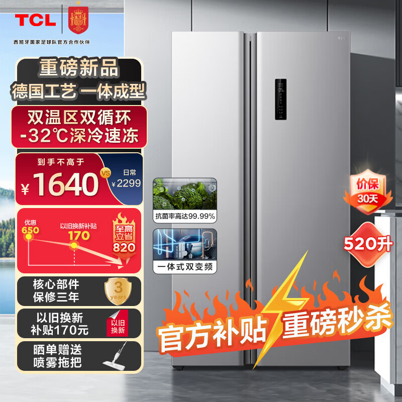 TCL 520升大容量对开门双开门冰箱 一体式双变频精细分区超薄机身 风冷无霜冷藏冷冻家用低噪音电冰箱 520升星辰银 纤薄双开门冰箱价格:2299.00元!