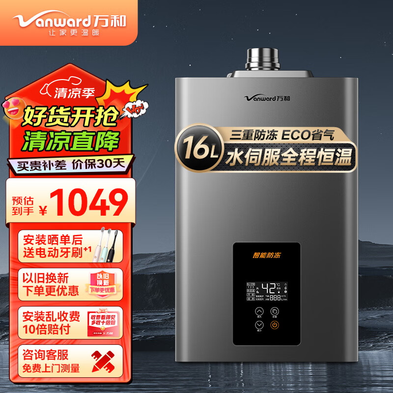 万和(Vanward)燃气热水器家用水伺服恒温三重防冻变频节能防CO高抗风565W 16L 【天然气款】价格:1099.00元!