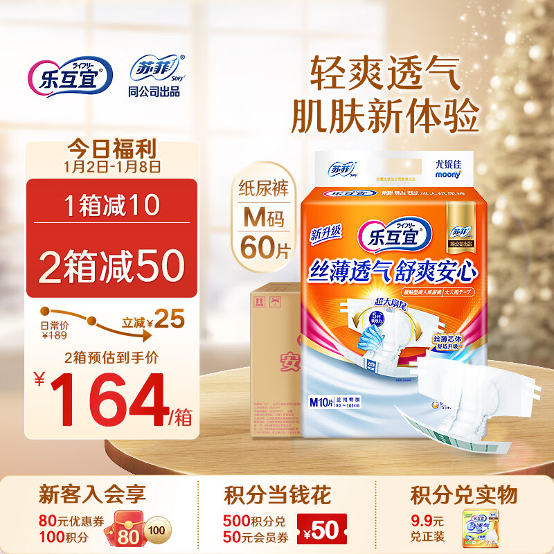 乐互宜丝薄透气成人纸尿裤黏贴式老年人腰贴型尿不湿M码箱装60片价格:189.00元!