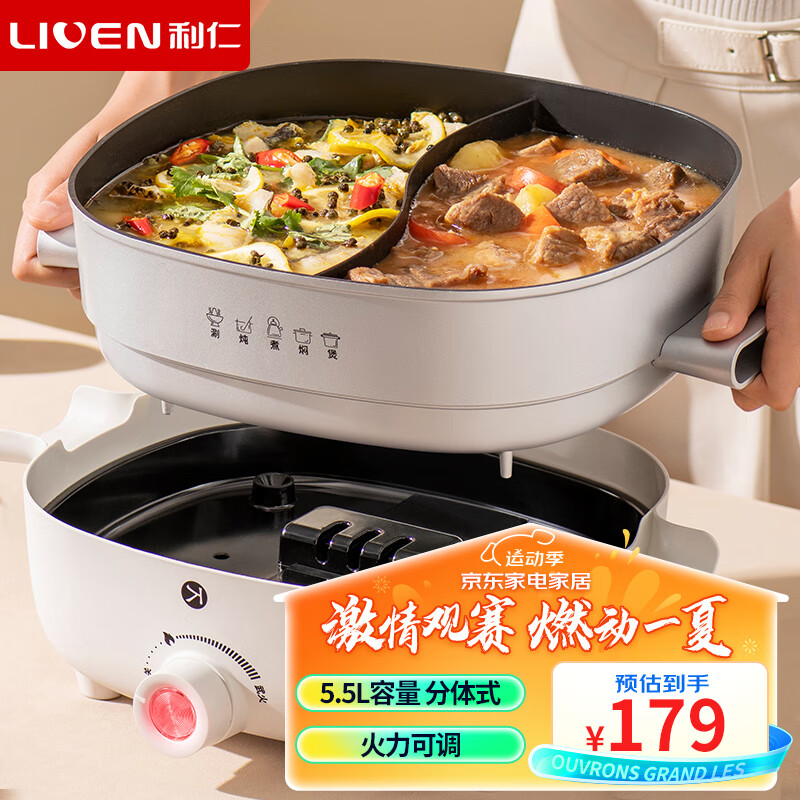 利仁(Liven)电煮锅鸳鸯电火锅家用火锅锅多功能电热锅多用途电锅煎烤涮肉一体锅5.5升价格:179.00元!