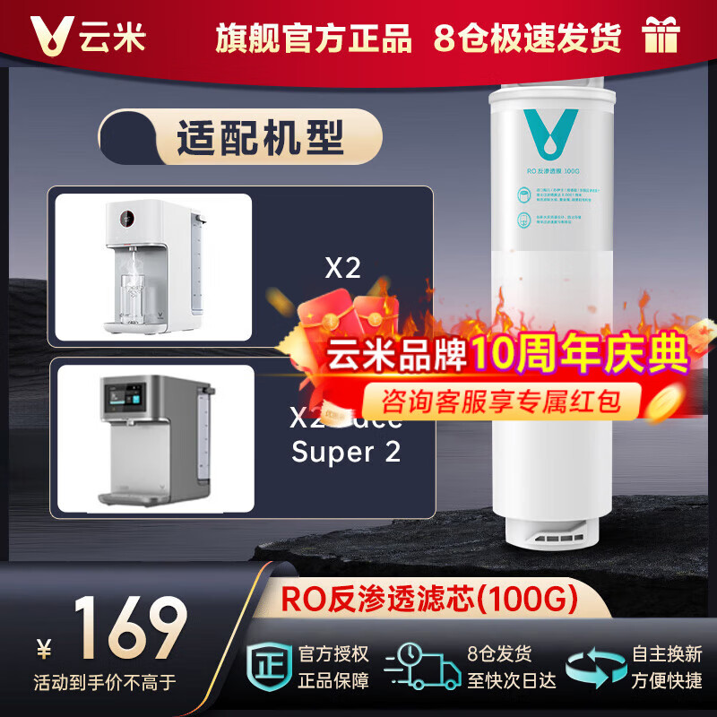 云米(VIOMI) 升级款云米净水器滤芯适配机型S2、Fast3、X2、Quick5、MeePlus、澎湃/Fast 1000G 2号RO膜100G(X2/X2 Face)价格:188.00元!