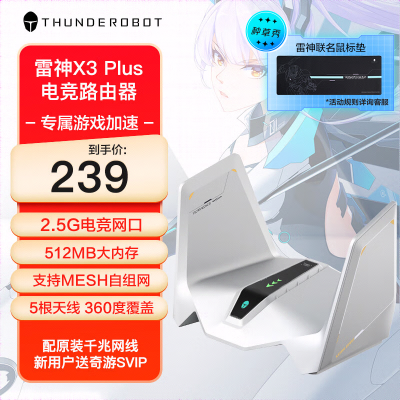 雷神(ThundeRobot)X3 Plus白电竞路由器满血WIFI6千兆无线 5G双频 Mesh 3000M无线速率 5根天线 游戏加速穿墙王价格:239.00元!