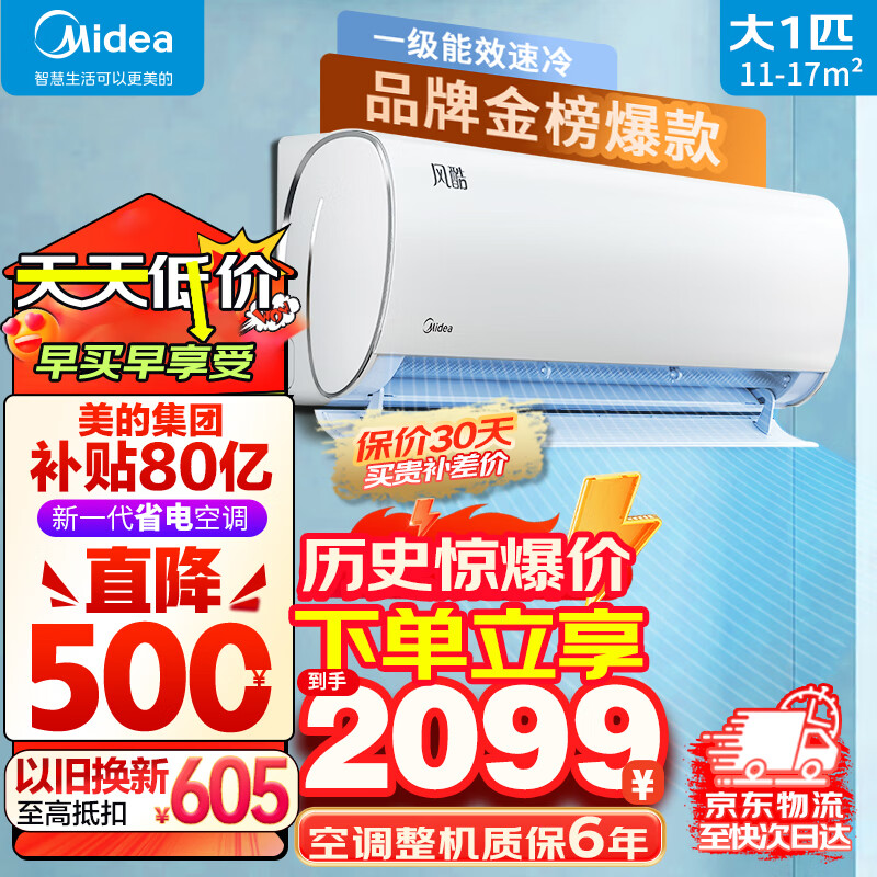 美的(Midea)风酷 空调挂机大1匹新一级能效省电全直流变频冷暖空调节能壁挂式大风量空调 KFR-26GW/N8XHC1Ⅱ价格:2099.00元!