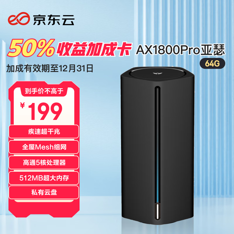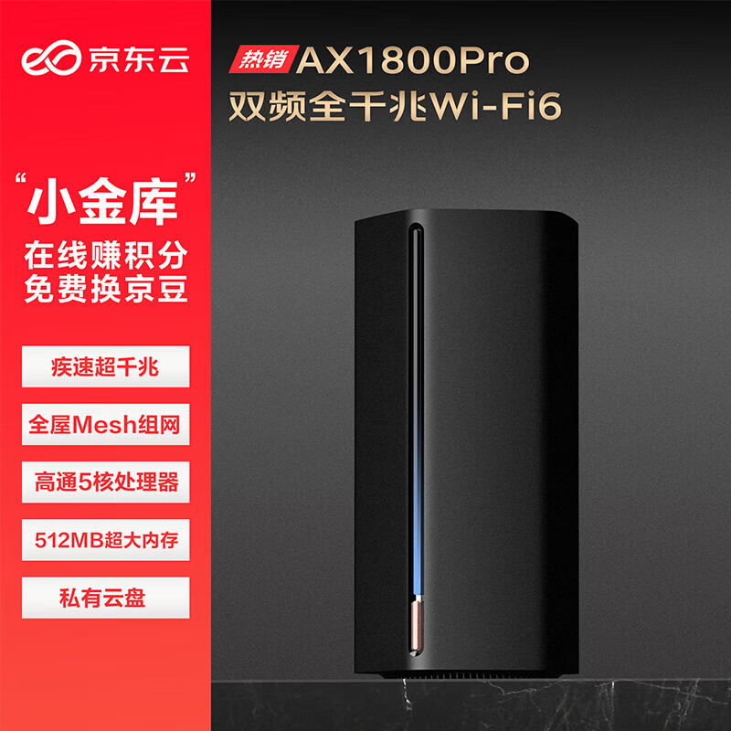 京东云无线宝 能赚京豆的云路由器 AX1800 Pro 64G 高通5核处理器 WIFI6 5G双频高速 游戏路由 无线穿墙路由价格:199.00元!