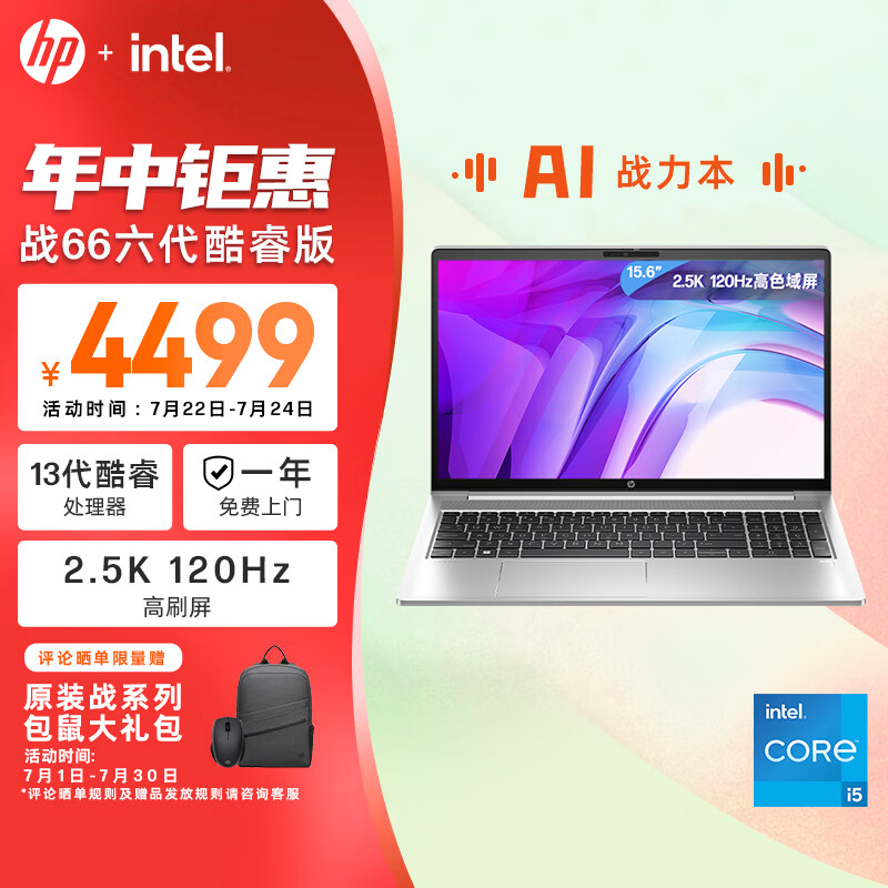 惠普(HP)战66 六代酷睿15.6英寸轻薄AI笔记本电脑(英特尔高性能i5 32G 1T 2.5K高色域120Hz)价格:4499.00元!