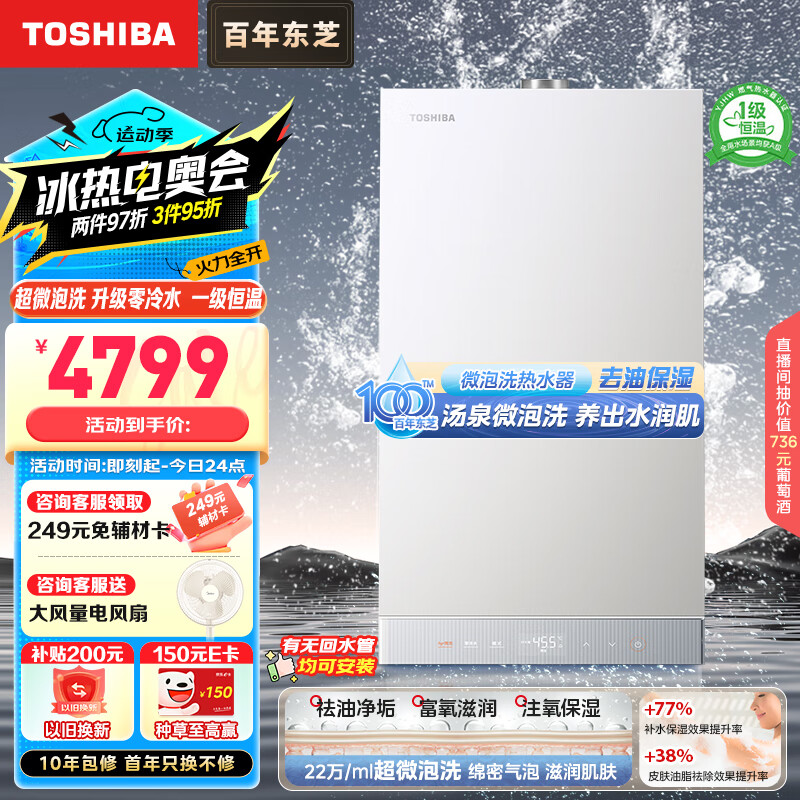 东芝(TOSHIBA)16升燃气热水器 微泡洗 零冷水一级恒温 水伺服变频下置风机 天然气强排式家用TSC6价格:4799.00元!