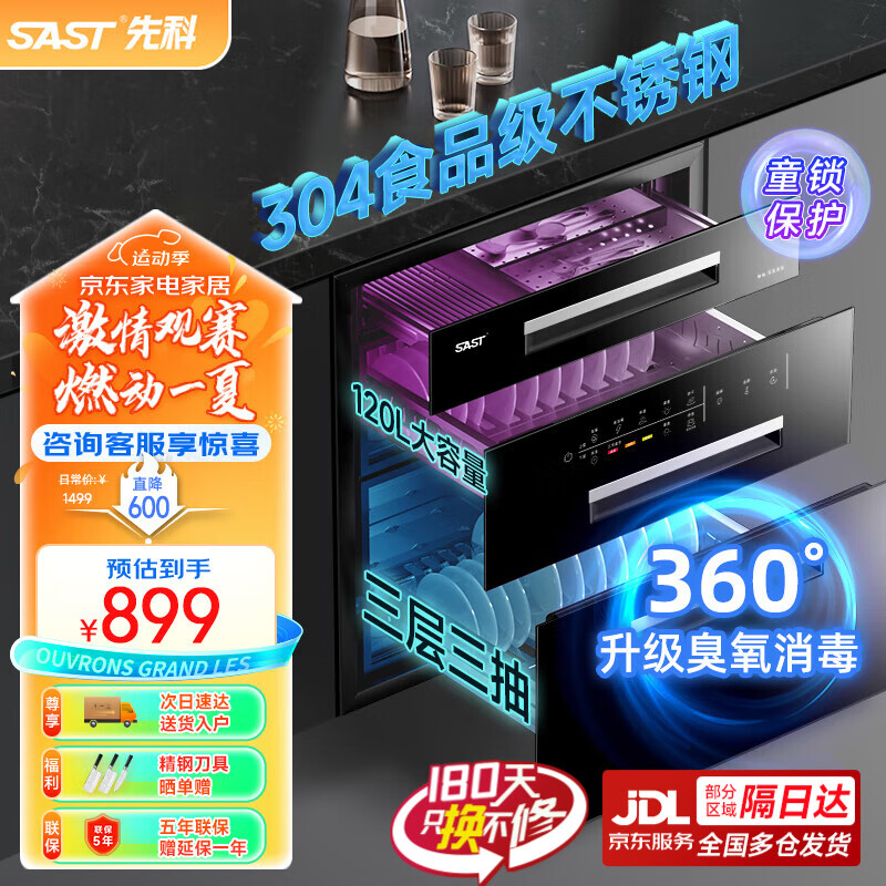 先科(SAST)消毒碗柜嵌入式家用厨房小型保洁柜三层双层大容量婴儿奶瓶餐具碗筷 120L 臭氧消毒/二消毒/童锁保护价格:1499.00元!