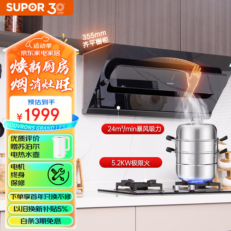 苏泊尔(SUPOR)抽油烟机 24m3/min大吸力 变频侧吸式脱排抽吸油烟机家用 挥手智控免拆洗烟灶套装 DJ50S+DB28液价格:1999.00元!