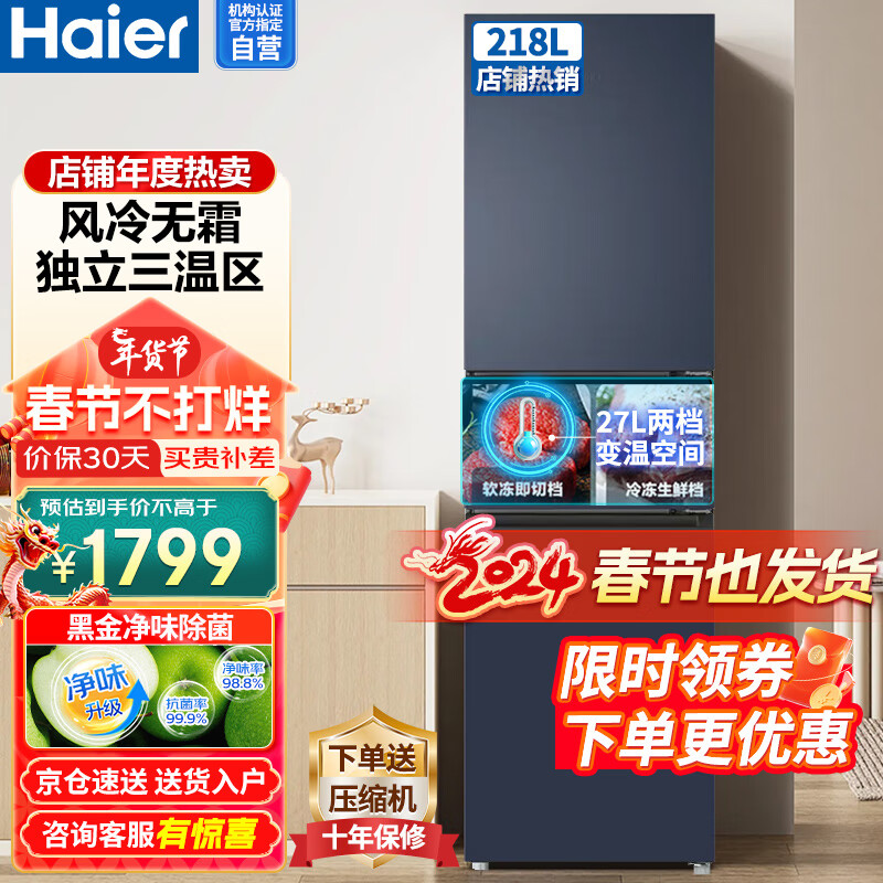 海尔(Haier)冰箱218升三门风冷无霜中门两档变温超薄节能省电净味除菌小户型家用小型电冰箱BCD-218WGHC3R9B9价格:1699.00元!
