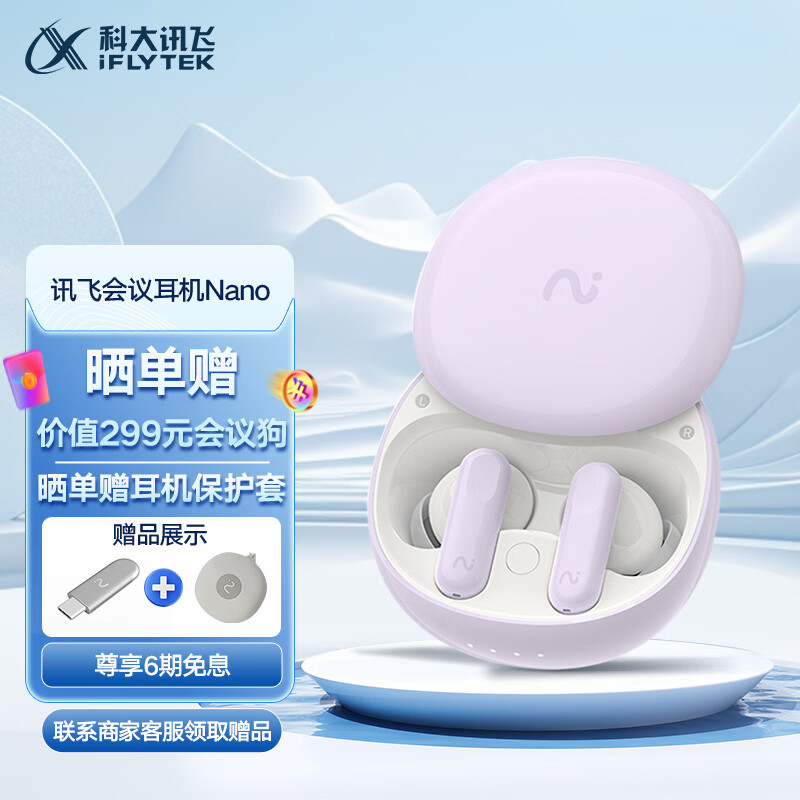 科大讯飞(iFLYTEK)录音降噪会议耳机Nano奶芋紫 无线蓝牙耳机 主动降噪 同传听译 录音转文字翻译苹果华为通用价格:1199.00元!