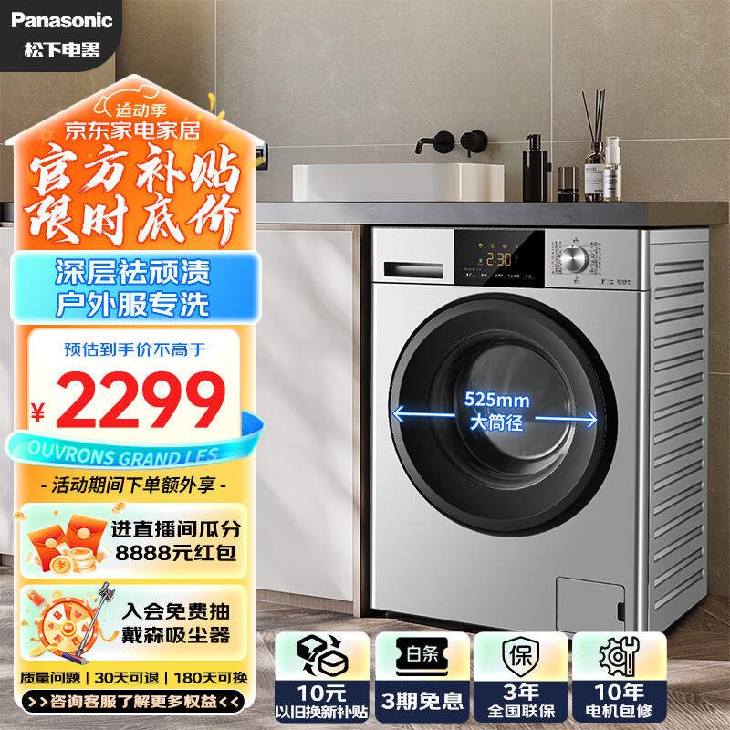 松下(Panasonic)滚筒洗衣机全自动 超薄全嵌 10公斤 泡沫净祛渍 户外服洗 超快洗XQG100-3N1S价格:2299.00元!