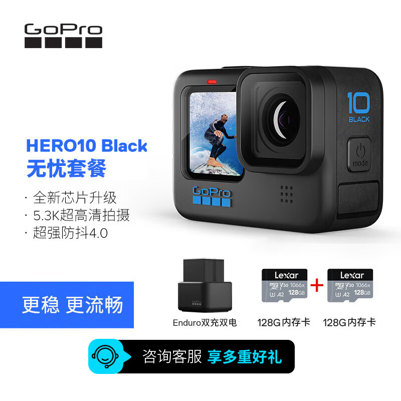 GoProH10 运动相机 户外摩托骑行 潜水防水防抖相机 无忧套装加128G存储卡套组价格:3397.00元!
