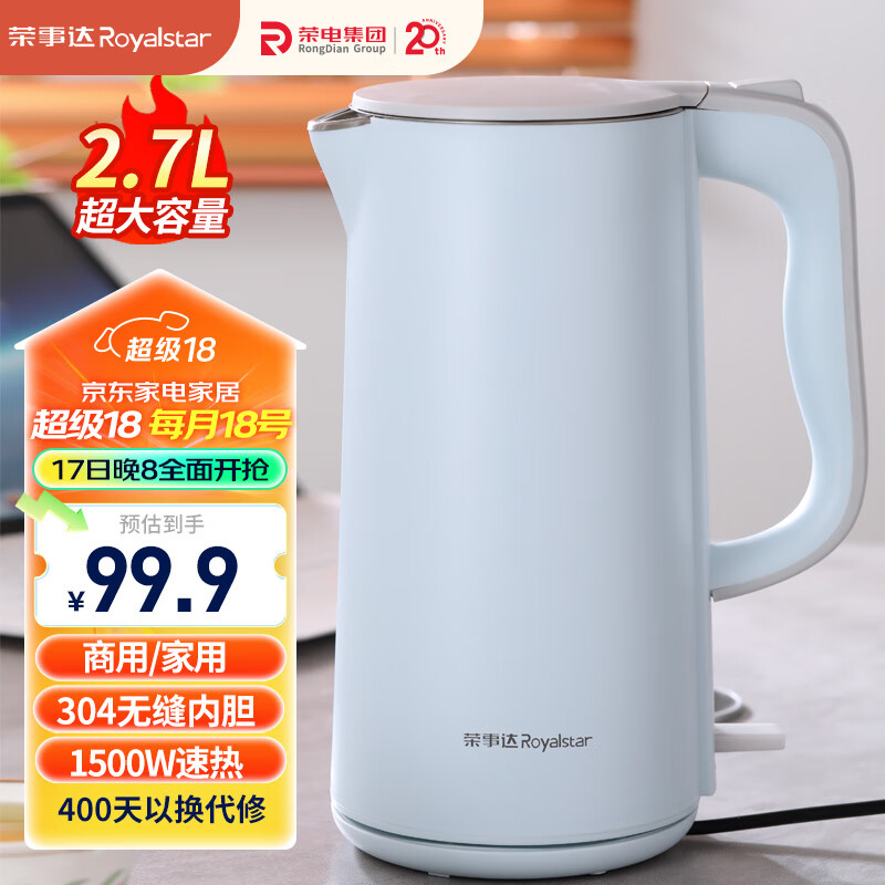 荣事达(Royalstar)电热水壶 烧水壶热水壶商用办公室2.7L超大容量双层防烫304不锈钢内胆水壶开水壶电水壶RS-KT27A价格:99.90元!