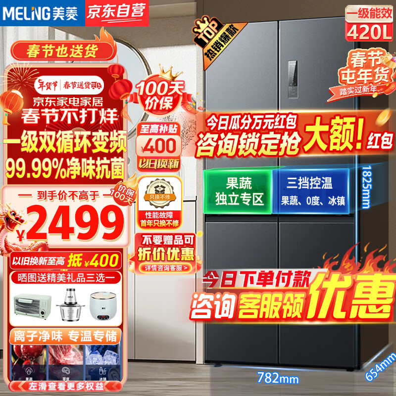 美菱(MeiLing)420升十字对开冰箱四开门家用一级风冷无霜大容量节能双变频双循环系统电冰箱 BCD-420WP9CX典雅灰价格:2498.00元!
