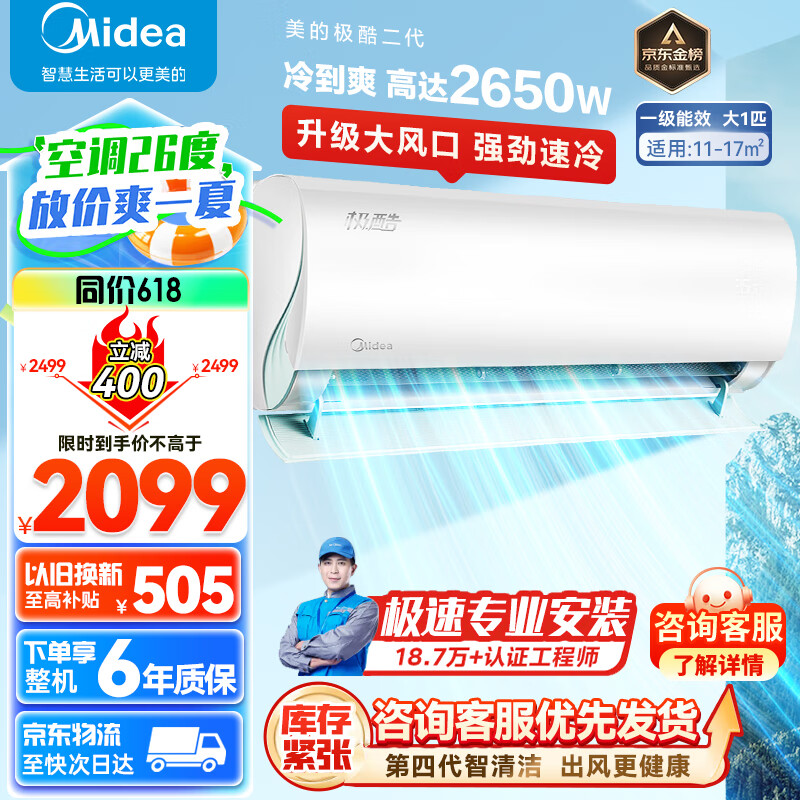 美的(Midea)空调挂机大1匹二代极酷新一级能效省电变频冷暖卧室家用壁挂节能 大风口空调 KFR-26GW/N8VHA1Ⅱ价格:2099.00元!