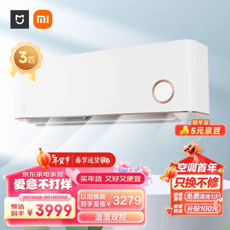 小米3匹 新二级能效 变频冷暖 智能互联 壁挂式卧室挂机 KFR-72GW/D1A2 鎏金版 以旧换新价格:3899.00元!