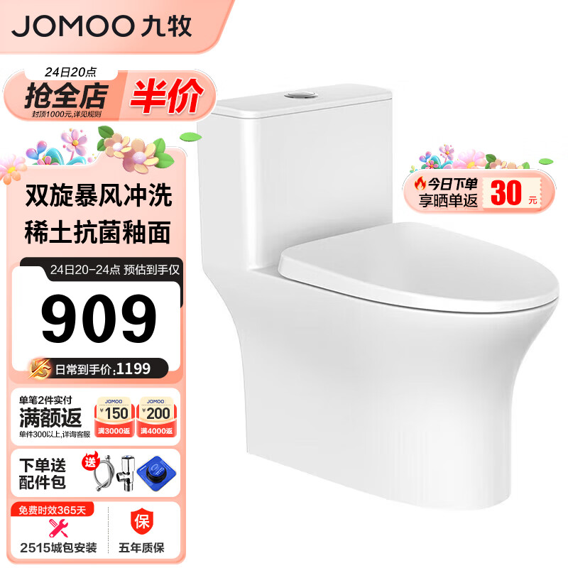 九牧(JOMOO)11396-2-1/41K-1抗菌一级水效坐便器虹吸式节水连体马桶400坑距价格:979.00元!
