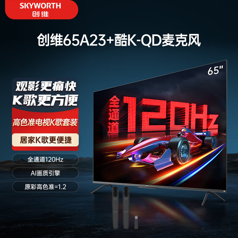 创维电视65A23+K-QD麦克风套装 65英寸电视机 全通道120Hz高刷 4K超高清护眼 家庭K歌影院 双支麦克风价格:2628.00元!
