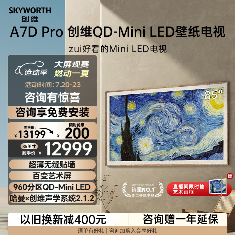 创维壁纸电视85A7D Pro 85英寸 超薄壁画艺术电视机 无缝贴墙 960分区量子点Mini LED巨幕大屏价格:12999.00元!