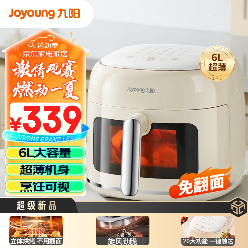 九阳(Joyoung)空气炸锅 不用翻面 家用 6L大容量 一键智能触控 超薄可视 蒸汽嫩炸 无油煎炸 KL60-V7价格:339.00元!
