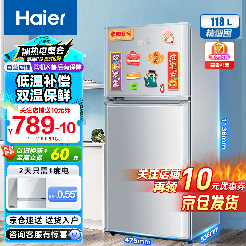海尔(Haier)冰箱小型 118升双门 冷藏冷冻 节能省电 家用办公宿舍租房推荐二门电冰箱公寓自用两门小冰箱价格:789.00元!