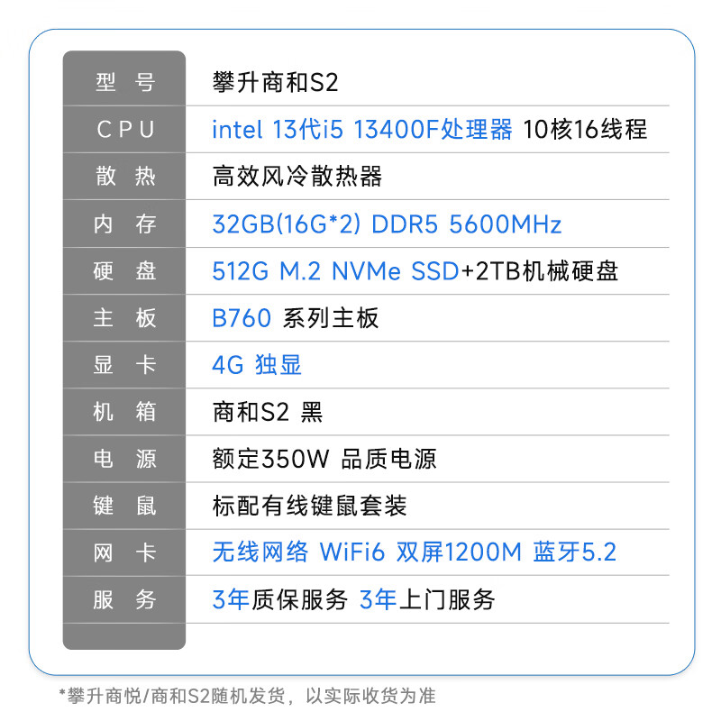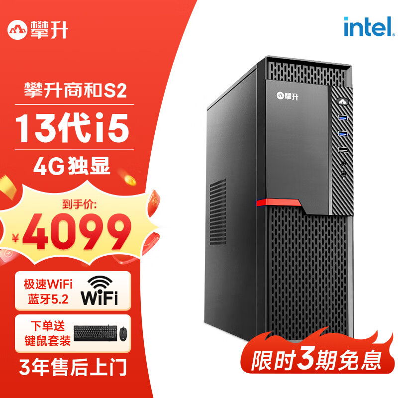 攀升商和S2 设计师办公商用台式电脑(i5-13400F 32GD5 512G+2T 4G独显 WiFi6 )单主机全套diy组装机价格:4499.00元!