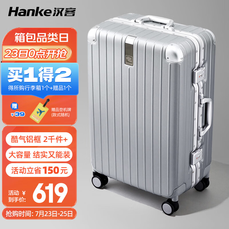 汉客行李箱铝框箱男拉杆箱女旅行箱80多升大容量26英寸浅灰色密码箱价格:769.00元!