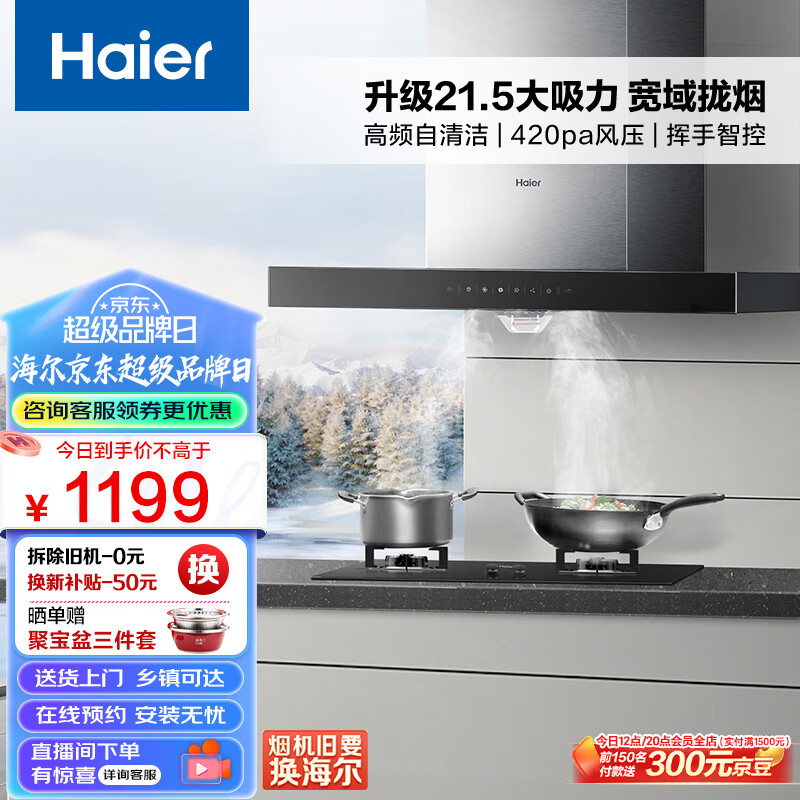 海尔(Haier)抽油烟机 顶吸式油烟机家用 升级21.5m3/min风量 高频自清洁挥手智控 以旧换新 抽油烟机大吸力T11价格:1299.00元!