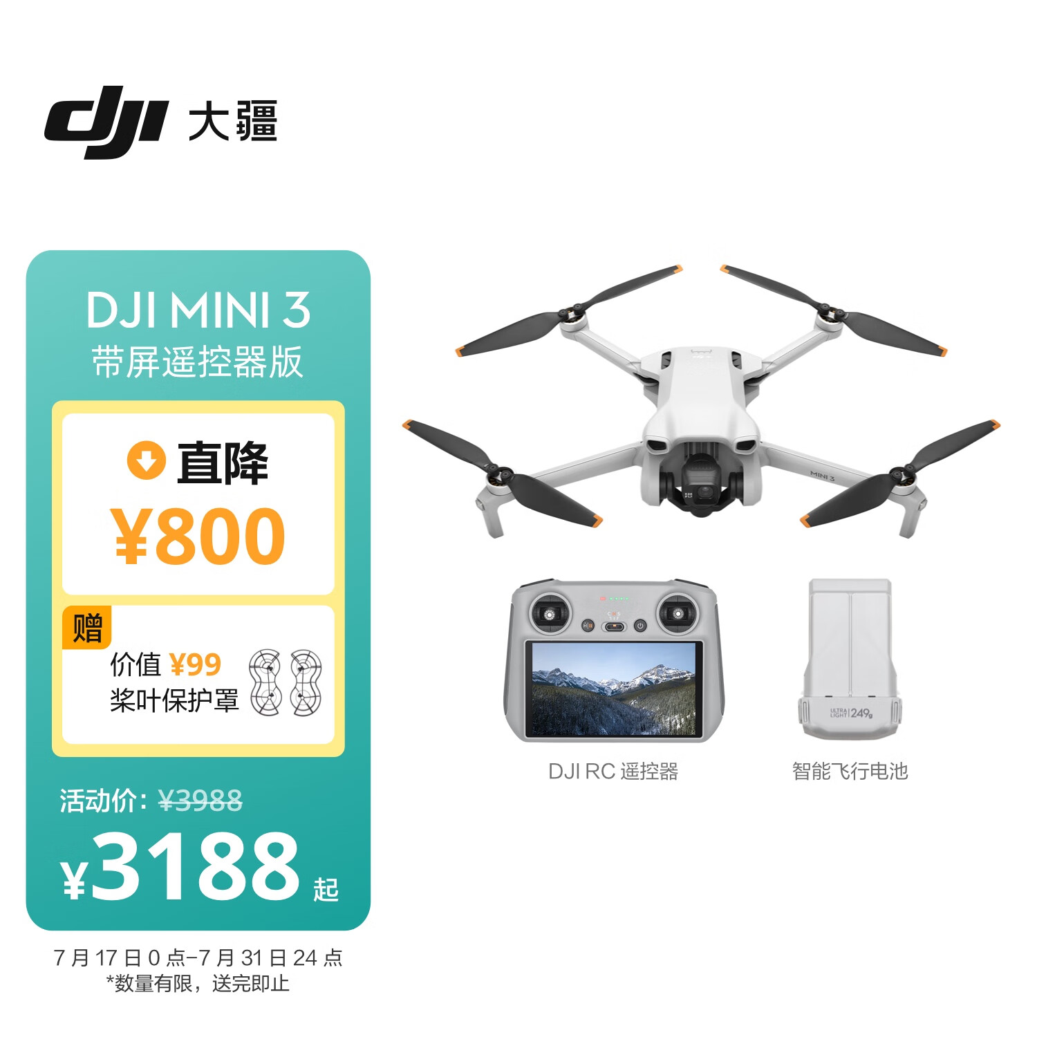 大疆 DJI Mini 3 带屏遥控器版 优选迷你航拍机 智能高清拍摄无人机 小型遥控飞机+随心换2年版实体卡价格:3716.00元!