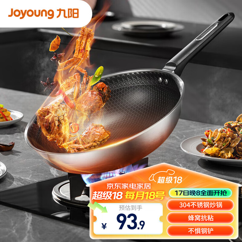 九阳(Joyoung)炒锅304不锈钢蜂窝炒菜锅不粘锅加大平底煎锅电磁炉燃气通用 30cm价格:129.00元!