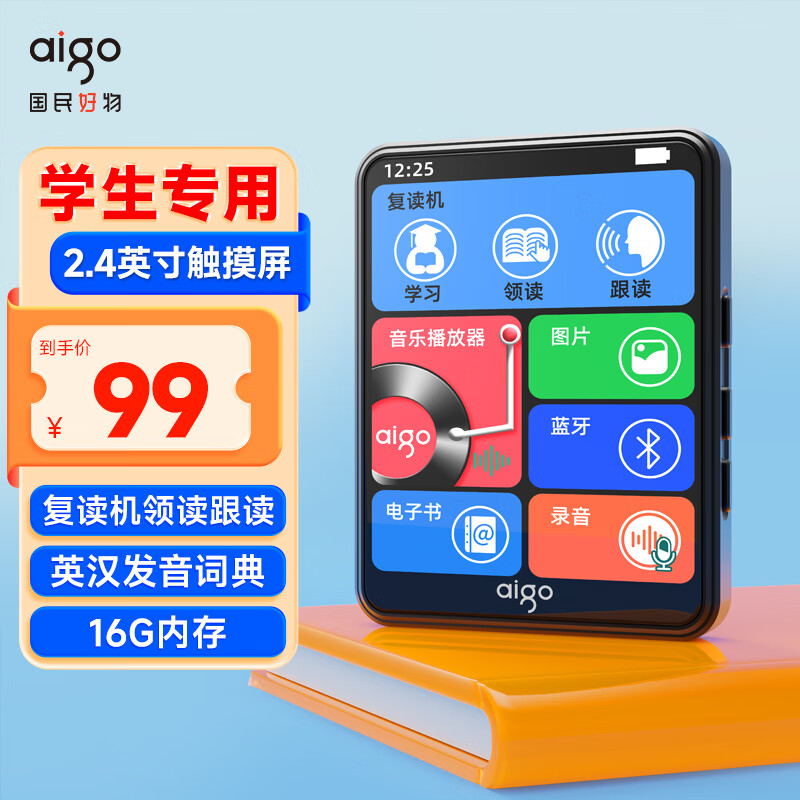 爱国者aigo 325-16G mp3/mp4播放器无损音乐随身听2.4英寸蓝牙外放发声词典电子书 学生听英语听力复读机价格:99.00元!