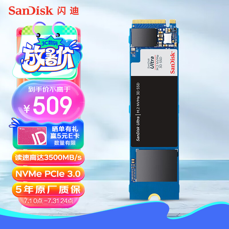 闪迪(SanDisk)1TB SSD固态硬盘 M.2接口(NVMe协议)四通道PCIe 3.0高速系列-游戏高速版|西部数据出品价格:509.00元!