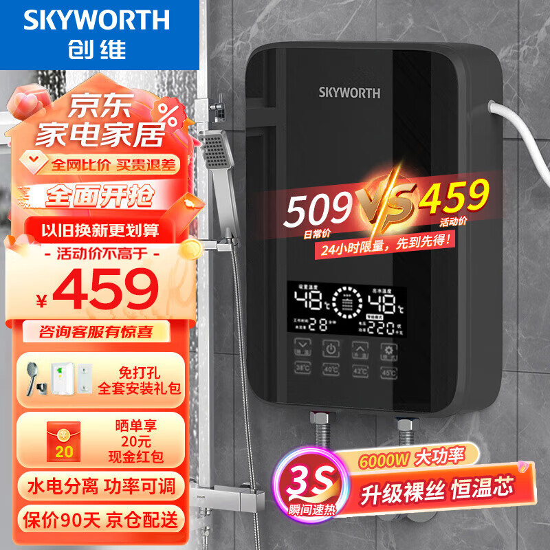 创维(Skyworth)即热式电热水器 速热式小型恒温淋浴免储水变频恒温淋浴机多功率可调D875拉丝黑6000W包安装价格:509.00元!