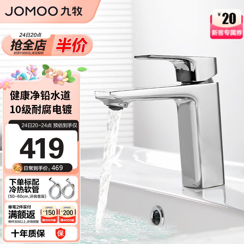 九牧(JOMOO)卫浴龙头台盆硅黄铜冷热单把方形手柄面盆龙头32349-590/1B-Z价格:454.00元!