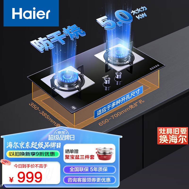 海尔(Haier)燃气灶 智能防干烧5.0kW大火力一级能效瞬燃点火台嵌两用天然气 煤气灶双头灶具QE9B1(天)价格:1099.00元!