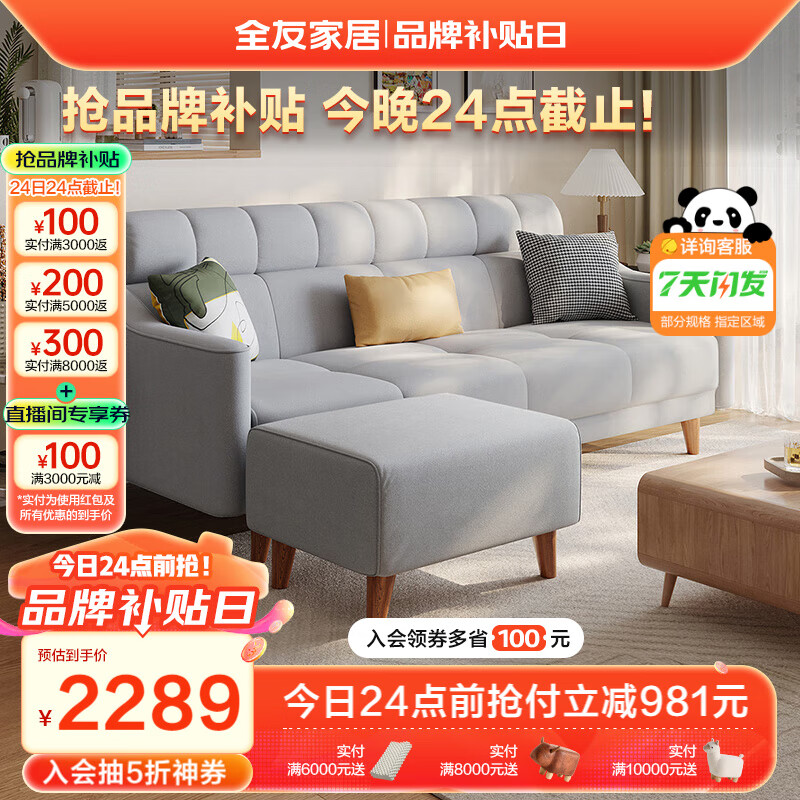全友家居 北欧简约科技布艺沙发客厅三人位小户型可折叠沙发床102265价格:3270.00元!