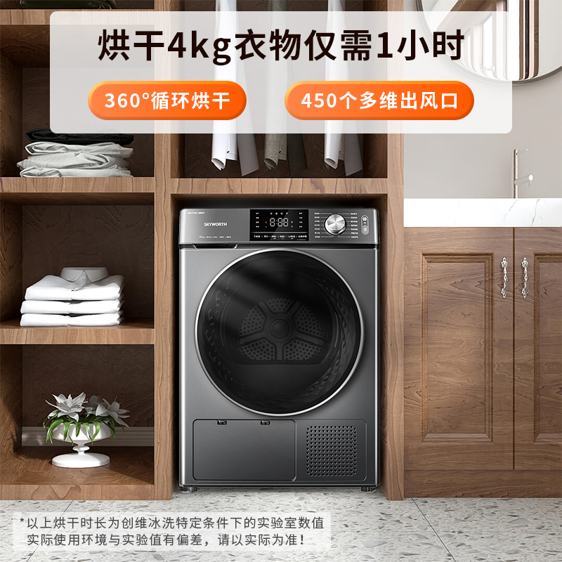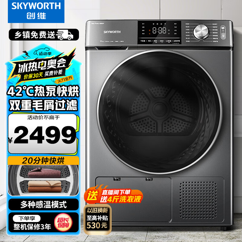 创维(SKYWORTH)10公斤热泵式烘干机 滚筒全自动干衣机 除潮祛除宠物毛发 大容量XQH100-H56价格:2599.00元!