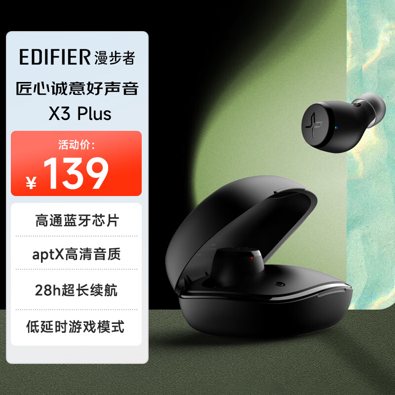 漫步者(EDIFIER)声迈X3 Plus 真无线蓝牙耳机 TWS音乐运动耳机 适用苹果小米华为 暗夜黑价格:139.00元!