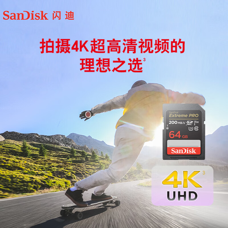 闪迪(SanDisk)64GB SD内存卡 4K V30 U3 C10 相机存储卡 读速200MB/s 写速90MB/s 微单/单反相机内存卡价格:129.00元!