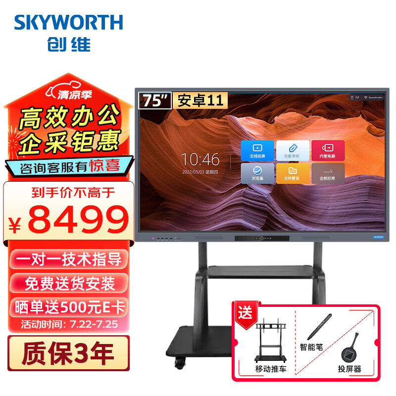 创维(Skyworth)会议平板75英寸智能触摸一体机教育培训电子白板无线传屏投影触屏电视75DSH5投屏器推车商用显示价格:8499.00元!