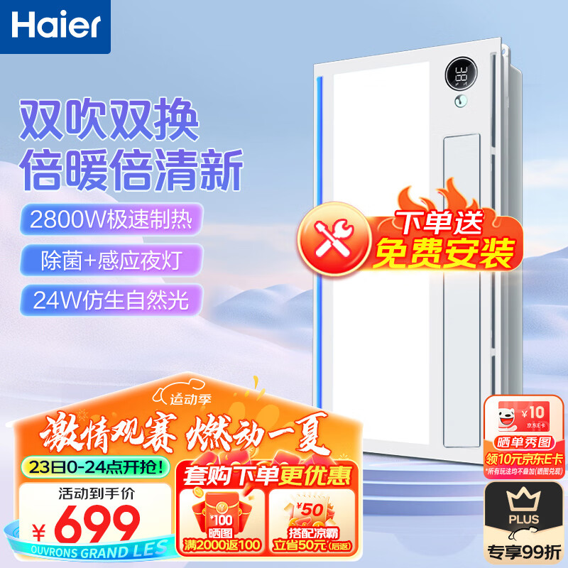 海尔风暖浴霸暖风照明排气一体卫生间暖风机浴室集成吊顶无线浴霸HD28价格:749.00元!